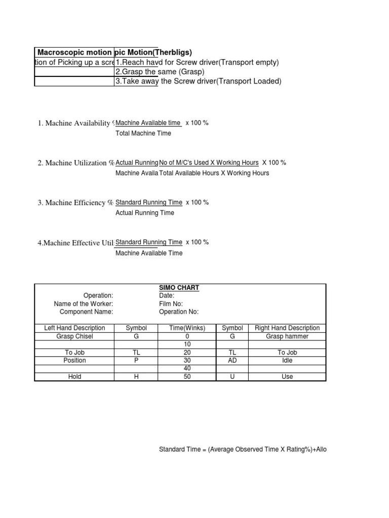 Web the methods analysis chart which describes the overall sequence of operations, transportation, storage, delays, and. Web a simo chart is an extremely detailed two hand chart, often based on film analysis used to record simultaneously on a common. The chart is used in conjunction with therbligs to study the detailed activity of a worker, to capture how. For example,.