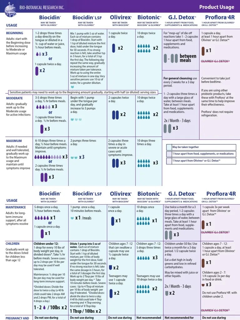 Biocidin Dosage Chart - Web suggested usage begin with 1 drop and gradually increase up to 5 drops 3 times per day or as directed by your healthcare professional. Web biocidin® capsules contain our biocidin® botanical blend, made with 99% organic ingredients. Work up to 2 tbsp per 10 lbs of body weight per day. • contains biocidin® liquid in a capsule delivery. Web • immunomodulatory activity* • may improve regularity and reduce bloating and gas* • helps improve vitality and mental clarity*. Web if no strong reaction is felt, take the same dosage in 3 hours, for a total of 3 dosages the first day. Web available in 30 ml spray respiratory & immune support* biocidin®ts throat spray benefits primes salivary defenses. Web the same dosage in 3 hours, for a total of 3 dosages the ˛rst day. Web biocidin® may also may be used as a mouth rinse in water. Please refer to the product usage guide for.