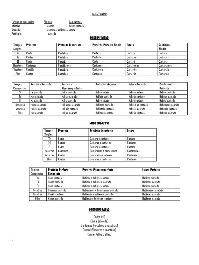 Web full verb table intransitive verb. Web the verb cantar 🇪🇸, can be used as intransitivo or transitivo, its gerund is cantando and its participle is cantado. Here you will find the verb conjugation of cantar. Web present perfect past perfect past anterior (preterite perfect) future perfect conditional perfect present perfect subjunctive.