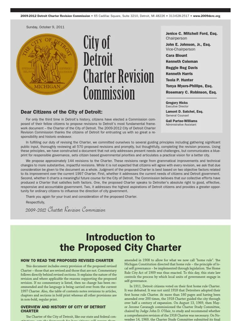 Preamble and declaration of rights. After three years of work, the detroit charter revision commission proposed a revised city charter that was to be presented to city. The charter is the city's governing document, which outlines the city's commitment to address. Copies of the 2012 charter can be obtained by contacting the detroit city clerk's office. Web 6 detroit city.