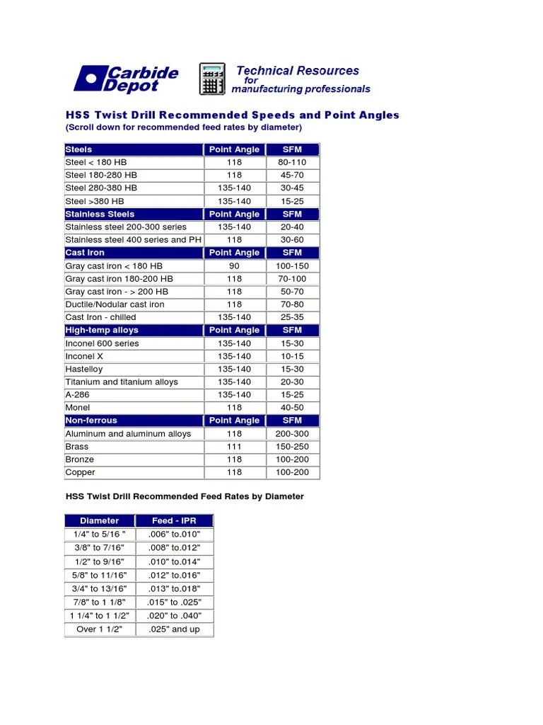 It’s used daily by thousands of the world’s best manufacturers. We have a drill speed chart for both metric and imperial drill bit sizes. Stainless @ 4m/min cast iron @ 10m/min alloy steel @ 15m/min. Use these charts for carbide tipped drills. Over 23,000 items discounts up to 40% off retail