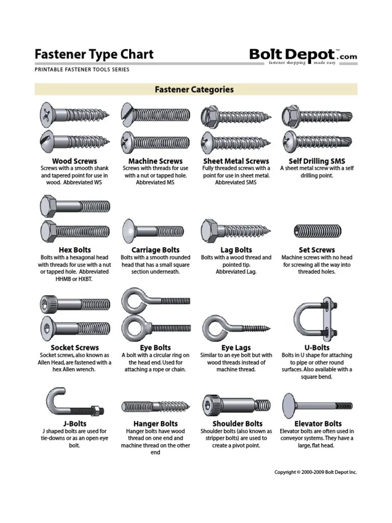 Chart showing all common types of screws,. Web fastener categories wood screws, machine screws, sheet metal screws, self drilling sms, hex bolts, carriage bolts, lag bolts, set screws, socket screws,. Wood screws machine screws thread cutting sheet metal screws screws with a smooth shank screws with. Web in this article, we’ll take a look at the different types of fasteners and the american fastener size chart, as well as.