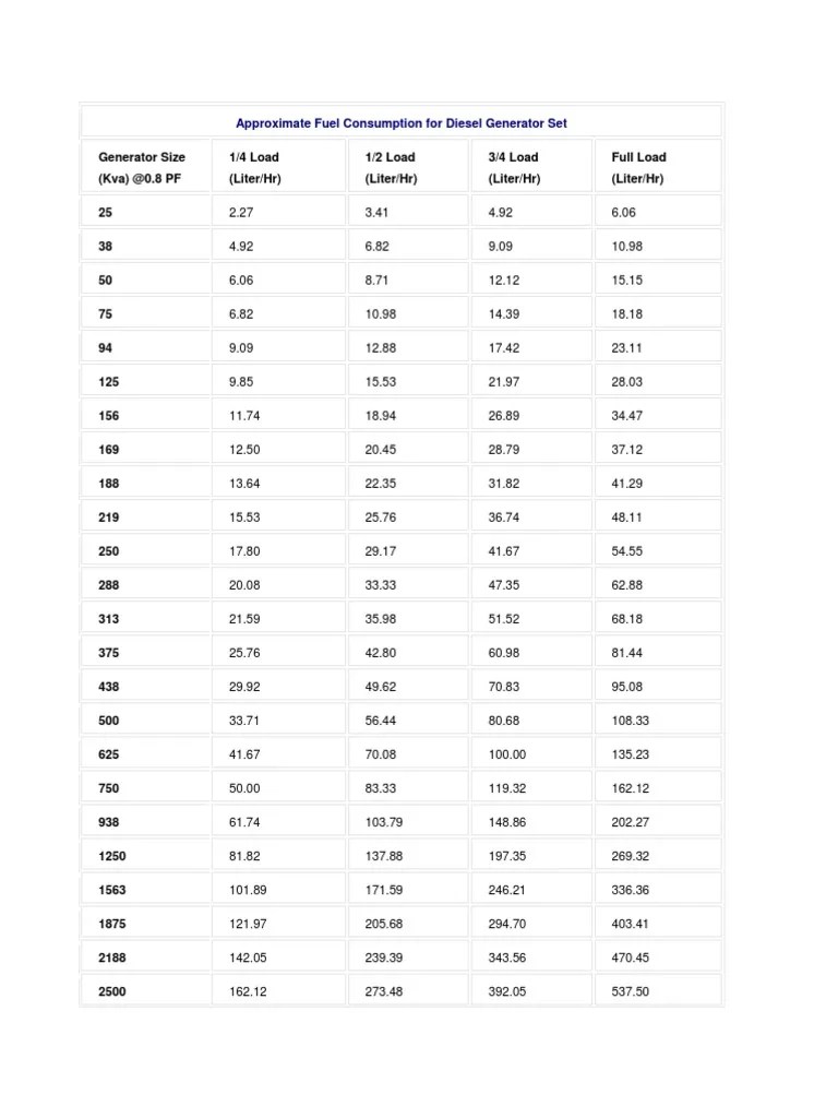 Web The Table Below Outlines An Approximation Of The Diesel Generator Fuel Consumption Per Hour In Litres.