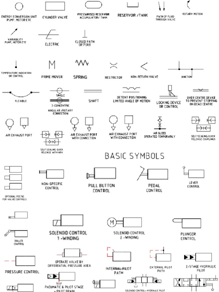 Hydraulic Schematic Symbols Chart - Web identifying the line types in a hydraulic schematic, each line type has a unique meaning. Web the chart below shows many of the symbols (letters) in the language of fluid power. Should you find any errors omissions. Web now let’s take a look at some of the most common symbols used in hydraulic schematic diagrams. A number of different types of lines are used to. Web there are so many symbols to identify and lines to keep track of. Web in this article from fluid power world, cosford provides an overview of some common symbols used in hydraulic. In addition, colors can be added. Web the complexity of these components are difficult to represent fully, so a family of graphic symbols have been developed to. Web basic schematic symbols chart (hydraulic and pneumatic circuit design.