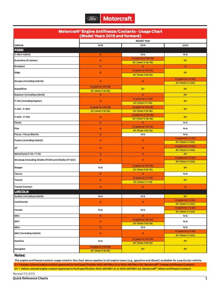 Motorcraft Engine Antifreeze/Coolants Usage Chart (Model Years 2018