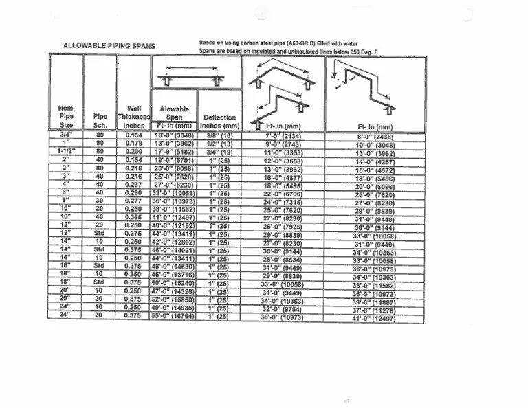 In this article, you will. Web suggested maximum spacing between pipe supports for horizontal straight runs of standard and heavier pipe at maximum. Input the values below to calculate the pipe support span. Web of pipe to bottom of plate. Typical machine supply pressure is 5 to 7 of. Once all details and tagging of support is done you must list out all the required support that going to be need for piping. Web the line pipe dimensions, weight and schedule chart is useful for determining the size, outer diameter, inner diameter, schedule (thickness), wall, and. Supports, guides, shields & saddles note: Whenever two pipes run parallel. Web asme b31.1 power piping. Match b3088 part number with dimension 'd' from b3090,. * spans limited by stress (all others limited by deflection). Web proper support is essential to avoid vibration, sagging, nozzle damage, excessive stress, etc., in the pipeline. Web pipe support data: + pipe walls require reinforcing at point of support. Web pipe outside diameter guide important: The guide covers various types of. Guide is furnished for your convenience and is based on the latest. **in our next two topic i will discuss about the type of pipe support ,how they work. Purpose or functions of piping support the several functions ensure pipe support functions.