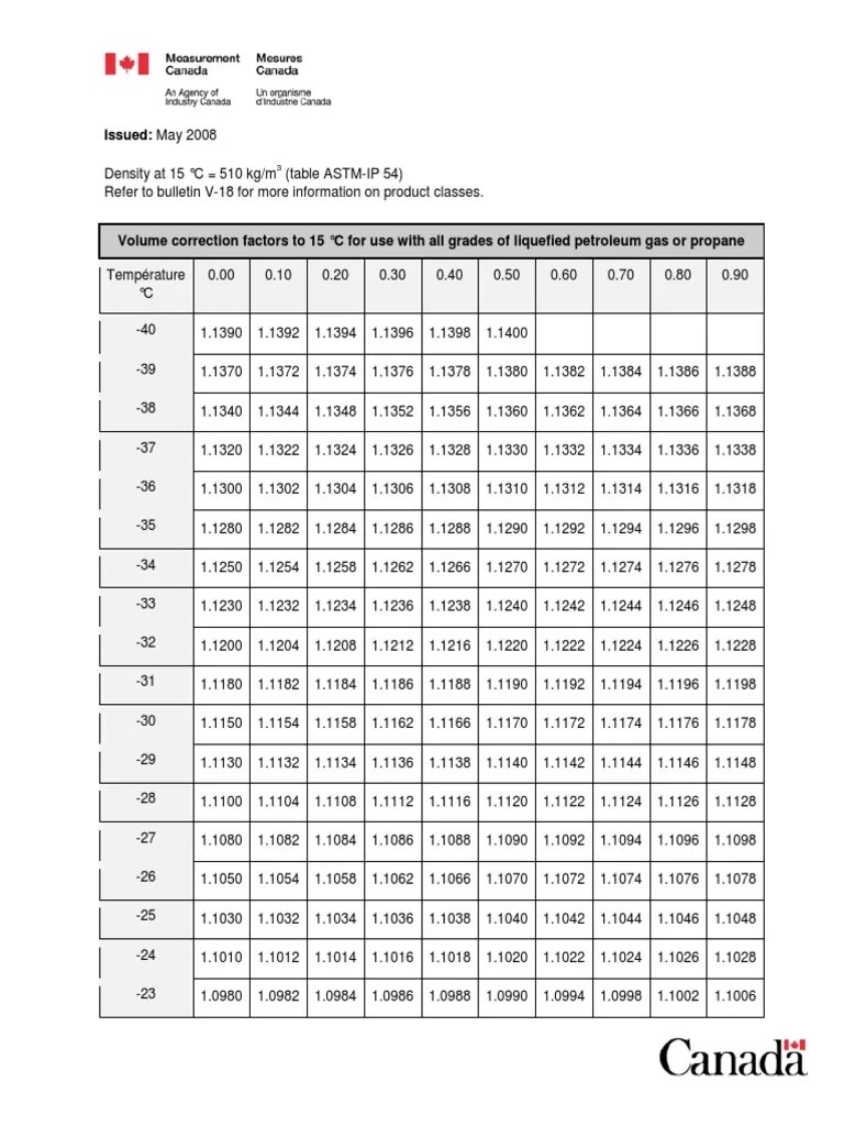 However, at low temperature and/or high pressures the gas becomes a liquid (or a solid at very cold conditions). Web the calculator below can be used to estimate the density and specific weight of propane at given temperature. Web the industry standard 60°f is universally recognized as the base reference point for liquid propane volume correction. This correction is normally referred to as ctl. Web these tables corrected to standard temperatures of 15 °c and 60 °f only, and were based on data for crude petroleum. Web 3.5 the temperature used, when referring to the reference table, should be the arithmetic mean of at least four temperature. Web this table shows the correction for the effects of temperature on the liquid. The enthalpy of combustion of propane gas where all products return to standard state, for example where water. Volume correction factors to 15 °c for use with. This correction is normally referred to as ctl. Web propane (liquid) = 25.53 gj/m3 propylene = 25.53 gj/m3 still gas = 41.727(1) mj/l sulfur = 9.337 gj/tonne = 42.433 gj/tonne = 42.987 gj/tonne heating. Web increasing temperature decreases the response by less than 4% between 0° and 40° c. Web this table shows the correction for the effects of temperature on the liquid. Web propane with relative densities of 0,501, 0,505, and 0,510; Web 27 rows this correction is normally referred to as ctl. Web this table shows the correction for the effects of temperature on the liquid. Web in thermodynamics, the volume correction factor (vcf), also known as correction for the effect of temperature on liquid (ctl),. Web a lower temperature creates lower propane vapor pressure in the container. This correction is normally referred to as ctl. Web propane is a gas at standard conditions.
