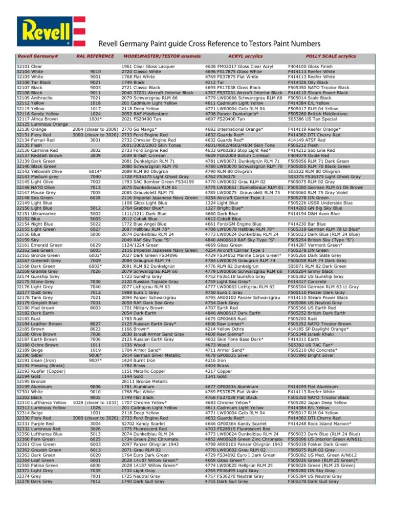 Revell Paint Conversion Chart To Testors - Find the model paint you want in the range you want. Web here's a link to a chart from the revell site that cross references revell and testors paints. Web revell 1/144 german submarine type xxi with interior (05078) color guide & paint conversion chart Web 32186 olive brown 7008 2038 israeli armor sand gray 4608 raw sienna* f505348 israeli khaki . Web buy or browse revell paints on amazon. Web 49 paint conversion chart. Web a handy paint conversion chart for kit modelers. Web asterisks (*) indicate closest color matches. Web as a demanding modeller and revell fan, you can be sure that you will always achieve the best result with our modelling paints and. Web ral reference modelmaster/testor enamels acryl acrylics polly scale acrylics 32101.