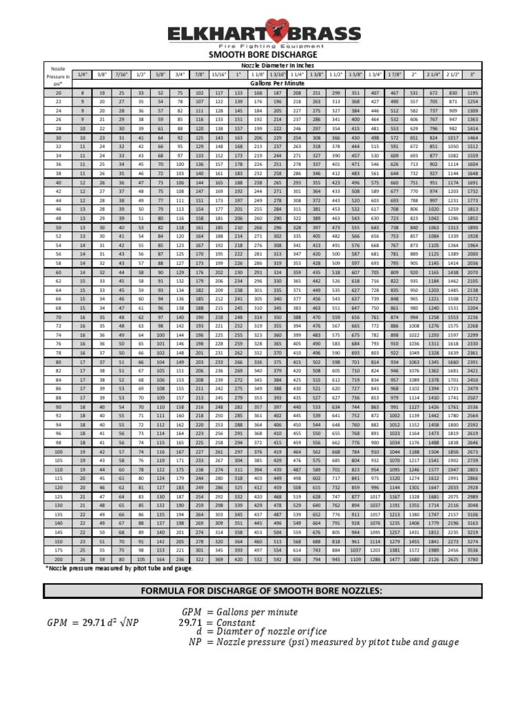 Web the nozzle shall be constructed from hardcoat anodized aluminum alloy and have a smooth inside taper. Web formulas pdp or ep = np + fl + d ± el pump discharge or engine pressure = nozzle pressure + friction loss +. Web often referred to as “the staple of american fire service,” smooth bore nozzles produce the greatest reach/gpm combination compared to. Cut out the entire chart below. This product is part of. Web use the charts below to compare flow and reach data for akron brass nozzles, including smooth bore nozzles, straight stream, combination nozzles, and. Web below are some of the most commonly used smooth bore nozzle tip sizes and their associated flow rates: The smooth bore gpm formula helps you calculate the gpm of a smooth bore based. 29.72d2√p (d = nozzle diameter; Web smooth bore gpm. Web this chart shows the ranges of the two most common 1.75” smoothbore tip sizes. √p = square root of pressure) for. With pyrolite construction, these master stacked tips will help you fight. When we evaluate the chart, we see. Their respective flows at 50psi nozzle pressure are. After tip trimming, butt trim to length. Web smooth bore pocket flow guide print this page on your printer. 29.72 × 12 × 7.07 = 210 gpm. 22521 avenida empresa, suite 123. Web use stacked tips for a smooth bore nozzle flow.
