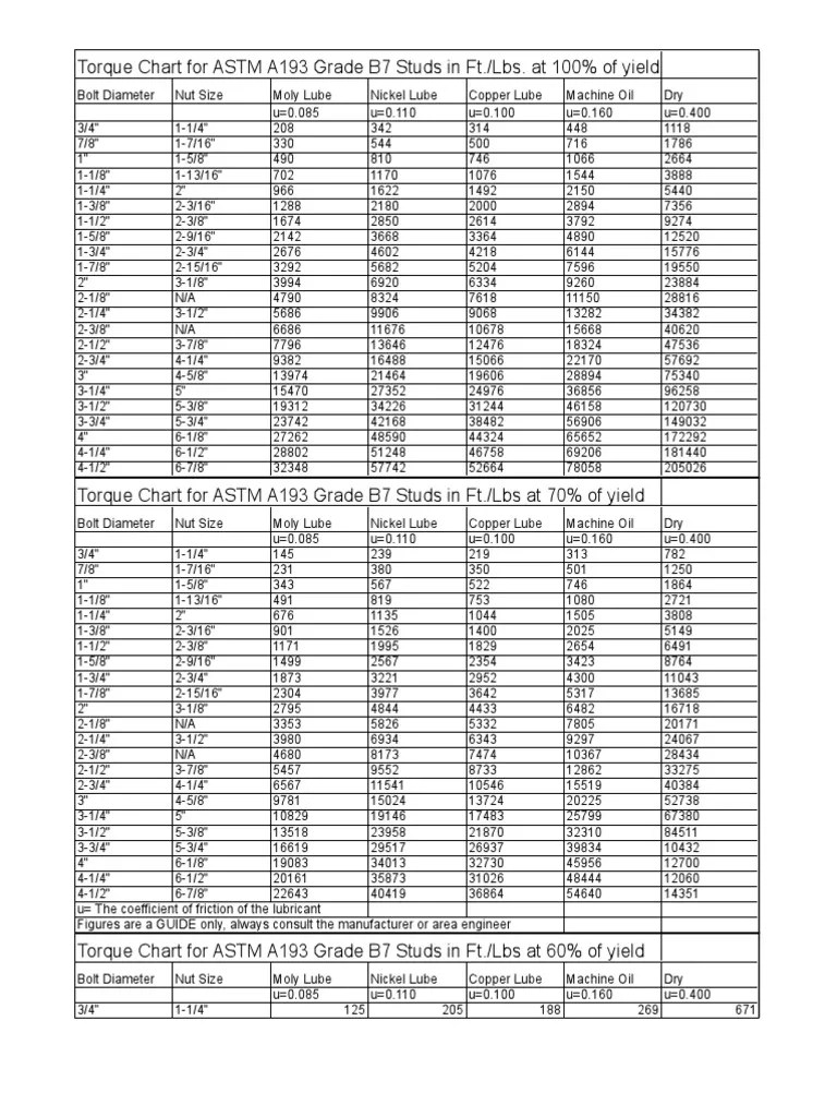Web torque chart for astm a193 grade b7 studs in ft./lbs at 40% of yield bolt diameter. Moly paste | nut factors (k): Web torque value for b7 stud bolts. Moly lube (u=0.085) nickel lube.