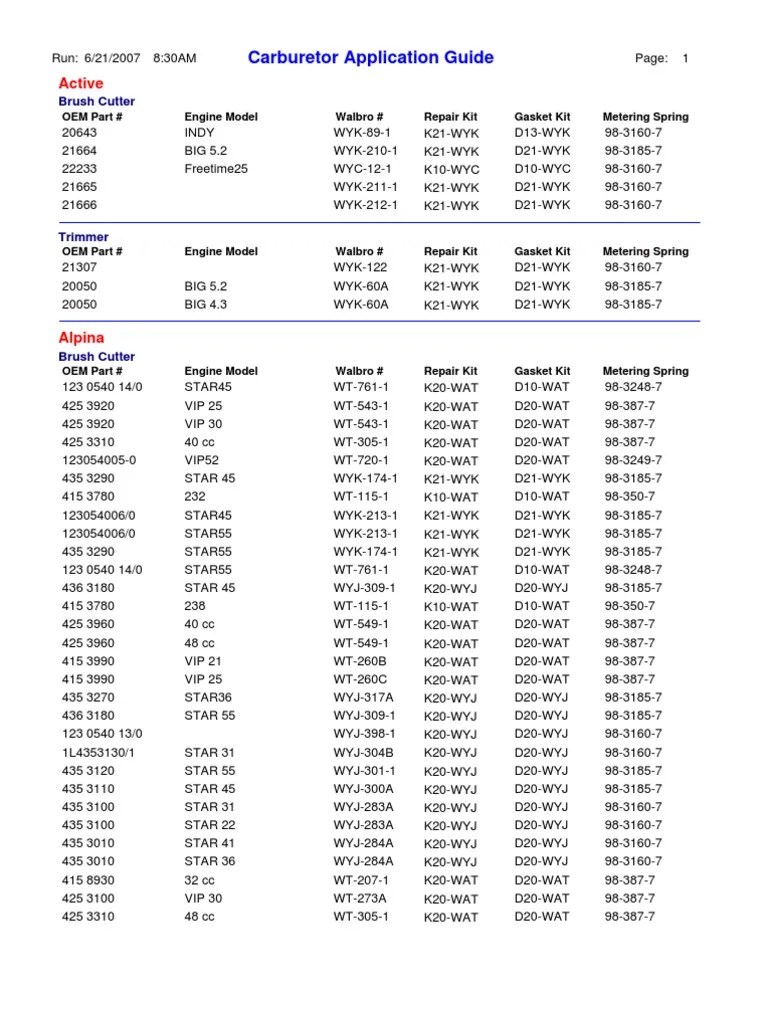Walbro Cross Reference Chart - Homelite (john deere) 1050 a. Stihl model number application carburetor part# stihl part number. Web walbro oem cross reference carburetors and parts 2 cycle: Web walbro/stihl cross reference chart. Web walbro fuel pump cross referrance to ac delcoamcacuraairtexaudibmwbentleyboschchryslercitroendaewoodelphidensofederal mogul / carterferrarifiatfordgeneral. Web learn how to find the part number on a walbro carburetor. Parts lookup for walbro power equipment is simpler than ever. Web looking for a carburetor or parts? Web appl.carburetor carburtor rep air kit diaphgragm model no.model no.part n o.part no.gasket set p p art no. Web please select the walbro model below: